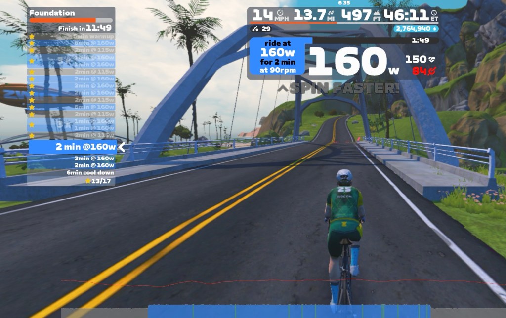 But base ride one done; zwift call these foundation – and they focus on relatively low intensity rides (zone 2, although my heart rate was hitting 170bpm at times so definitely not easy):