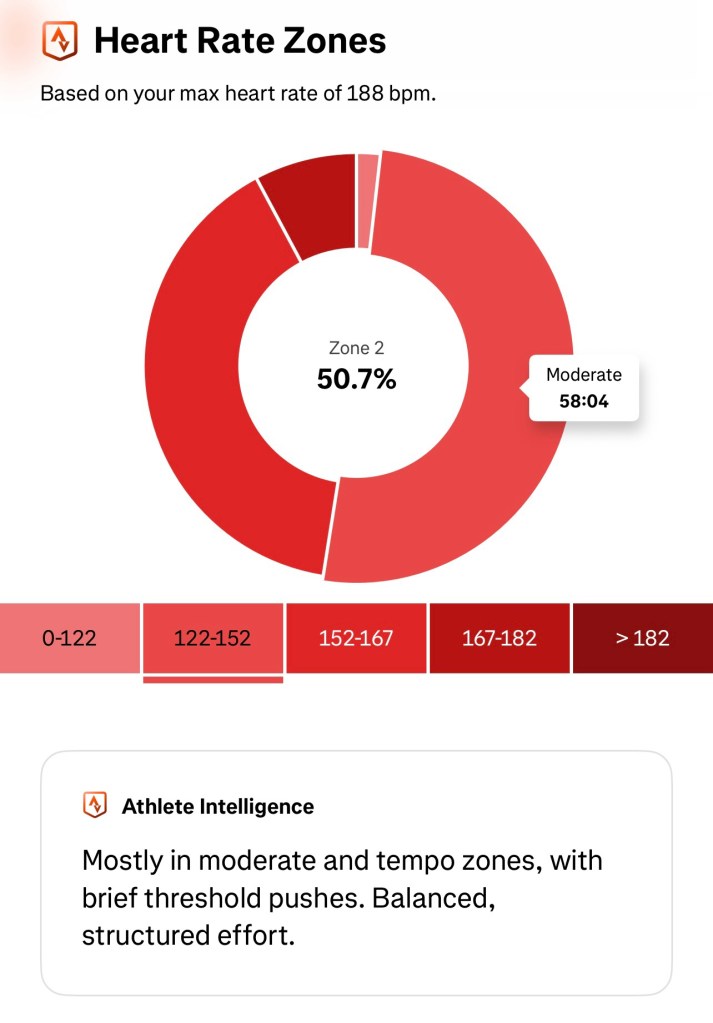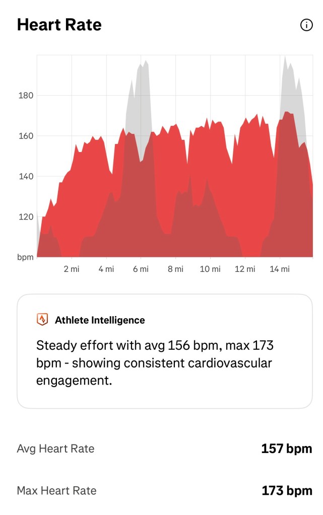 Attempting to keep the heart rate below 150, but ended up spending my time split across zone 2 and 3.. I think that’s ok….